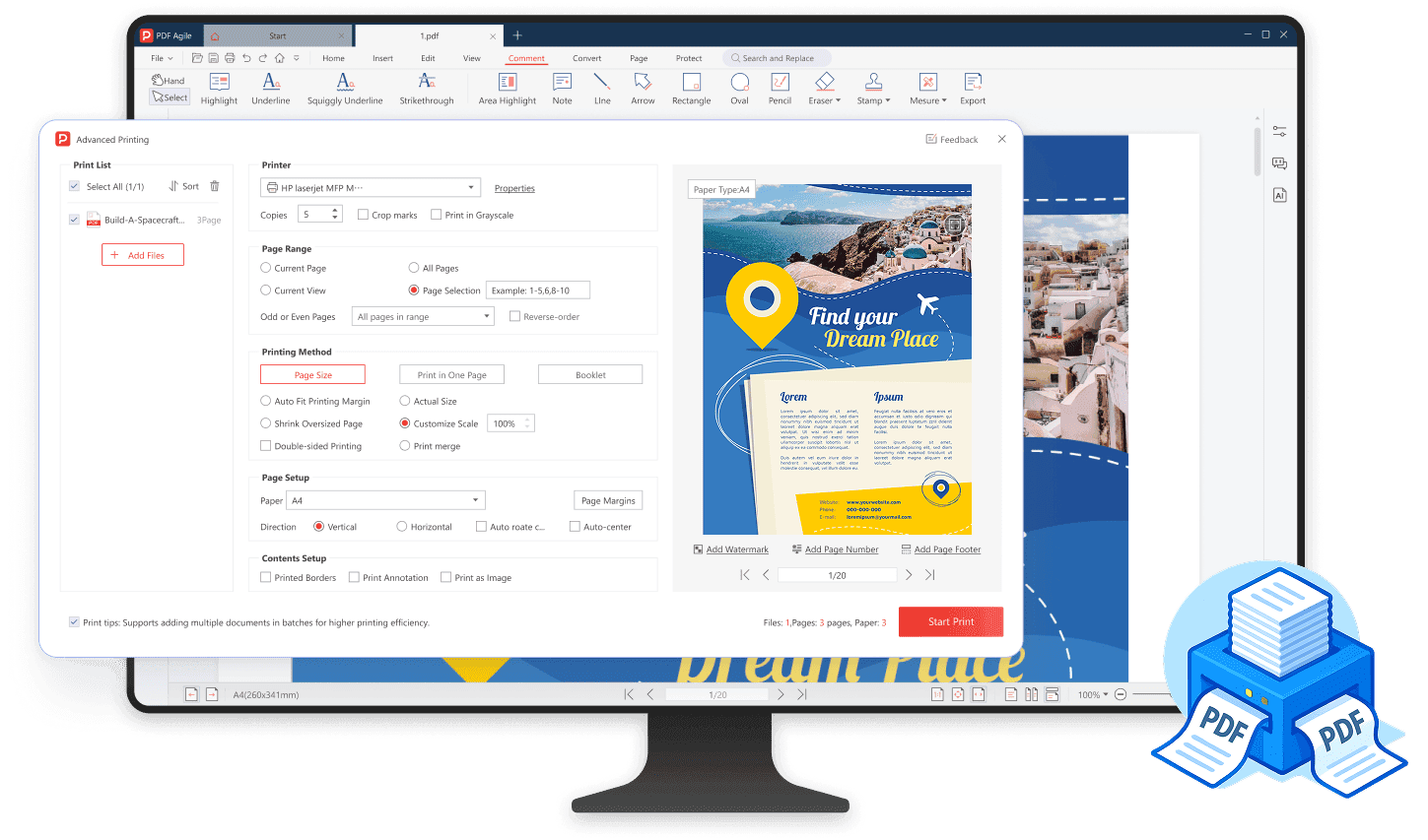 Toma el mando de tus trabajos de impresión de PDF con las diversas funciones de PDF Agile, que incluyen impresión por lotes eficiente, diseños de página flexibles, opciones de varias páginas por hoja y selección de rango avanzada.