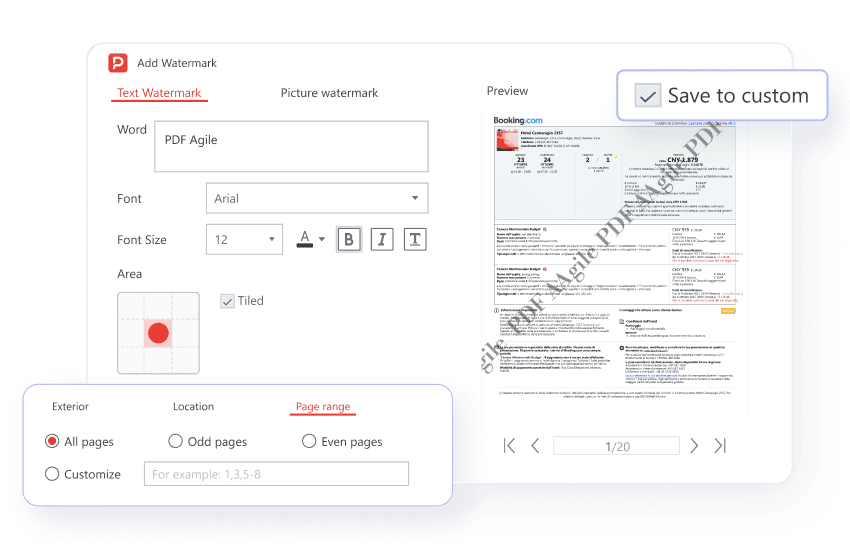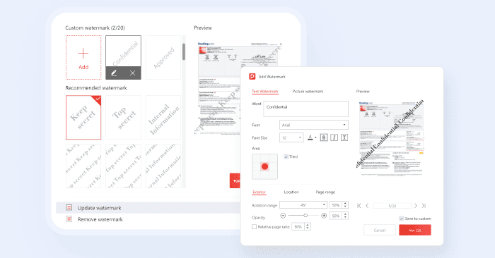 Add text-based watermarks with full control over font, size, color, opacity, and rotation. You can also save your frequently used watermark configurations to quickly apply the same watermark to multiple documents in the future.
