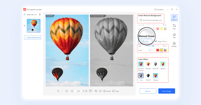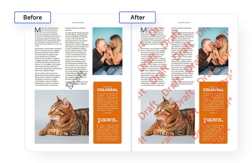Auto-recognize and remove distracting watermarks, logos or other branding assets in batch from multiple PDF pages with a single click. The preview window enables efficient adjustments, preventing unnecessary back-and-forth attempts.