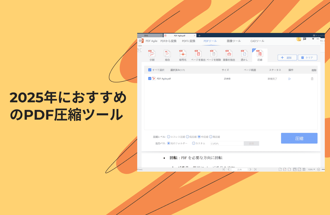 ヒント:PDF Agileでは、複数のPDFファイルを一度に圧縮することも可能です。「ファイルを追加」をクリックして複数のPDFファイルを追加し、「圧縮」をクリックすれば一括で処理できるため、作業時間を大幅に節約できます。