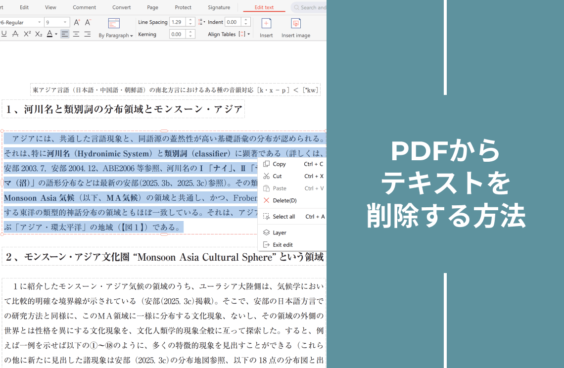 編集可能なPDFの場合、テキストを選択して右クリックし、「コピー」を選択すれば簡単に抽出できます。コピーしたテキストはテキストエディタやワープロソフトなどに貼り付け可能です。