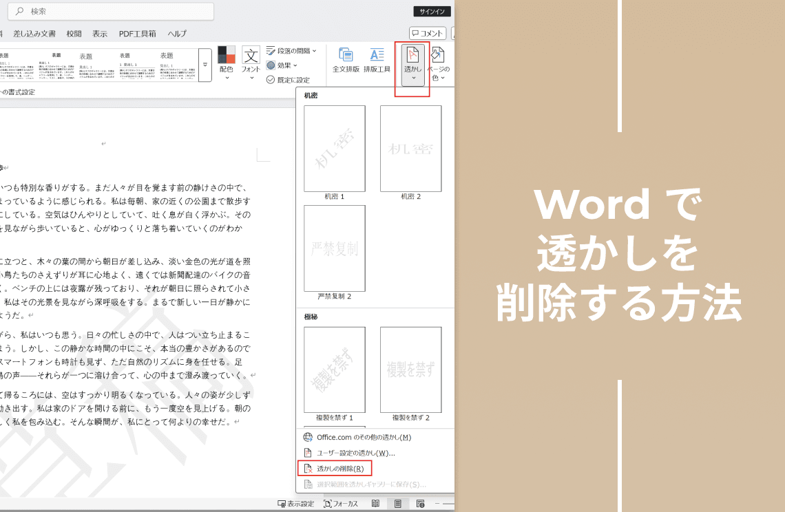 透かしは「機密」や「社内資料」などの目的で便利ですが、最終版を共有する際には邪魔になることもあります。
