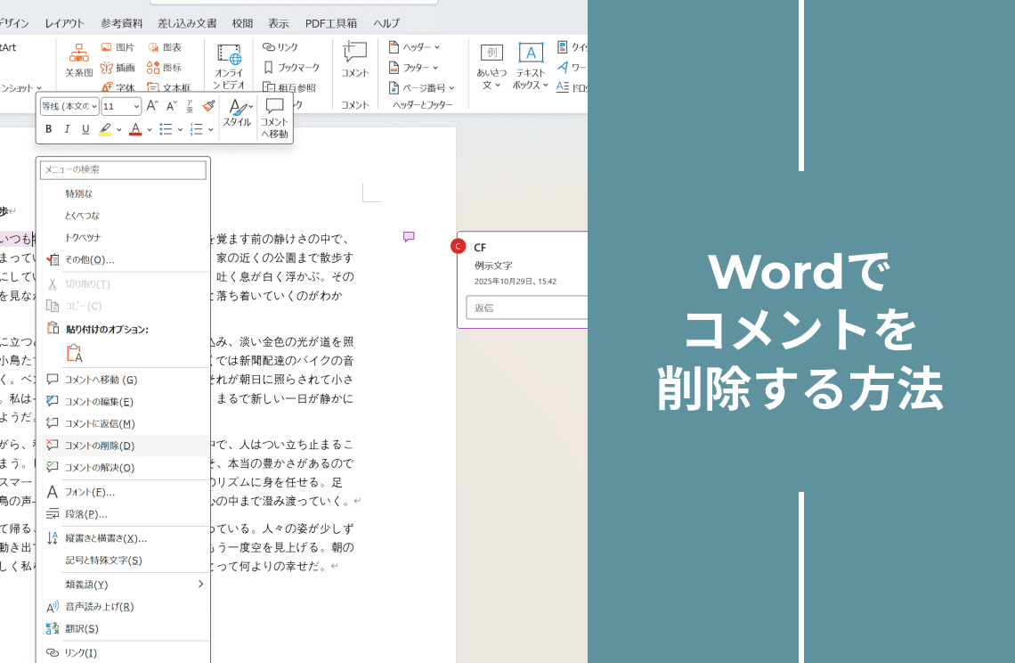- 選択後、右クリックして「削除」を選びます。これで、選択したすべてのコメントが削除されます。