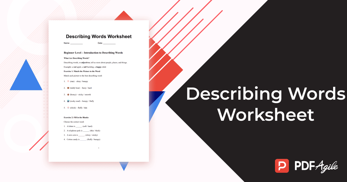 That’s why PDF Agile is excited to introduce our Describing Words Worksheet template, designed to guide users from beginner to advanced levels in using adjectives and sensory details effectively. This template, which is pre-filled with exercises and examples, offers a ready-to-use resource that saves time and enhances learning.
