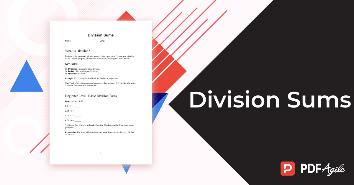Welcome to PDF Agile’s resource hub, where learning meets innovation! Are you looking for a structured, engaging way to master division—whether for a young student or your own professional development? Our newly launched Division Sums template is designed to transform complex concepts into manageable, interactive learning experiences. This pre-filled template, crafted by educational experts, guides users from basic division facts to real-world applications, complete with examples, tips, and solutions. In this instructional essay, we’ll explore how the template’s content builds mathematical confidence and demonstrate how PDF Agile’s powerful features can help you customize, practice, and excel. Let’s dive into the art of splitting numbers—and making learning infinitely more rewarding!