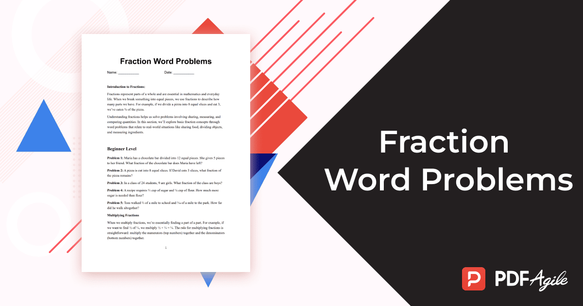 Fractions are the building blocks of mathematical reasoning, connecting classroom learning to real-world scenarios like sharing food, measuring ingredients, and dividing resources. However, many students struggle to translate word problems into fractional solutions. PDF Agile’s Fraction Word Problems template transforms this challenge into an engaging learning experience. This professionally designed template provides a structured journey from basic fraction concepts to complex operations, complete with real-life scenarios and detailed solutions.