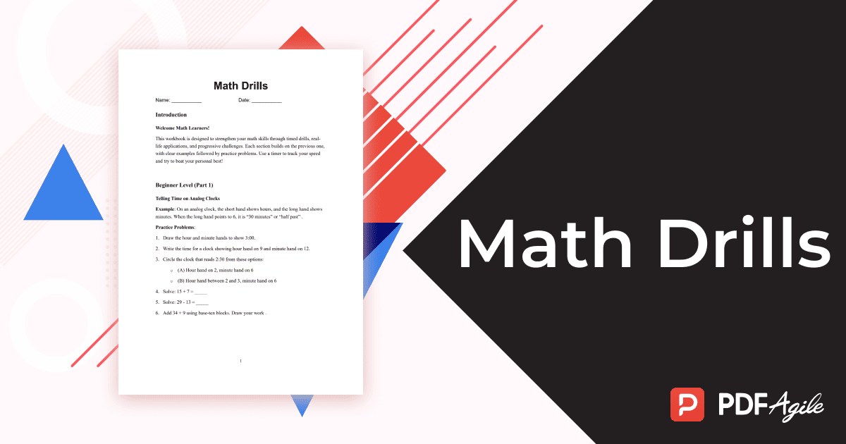 Mathematics is a journey—one that builds confidence through practice, precision, and progression. For math enthusiasts, mastering foundational skills like math drills addition and math drills multiplication can transform anxiety into accomplishment. PDF Agile, your go-to app for customizable PDF solutions, now offers a dynamic Math Drills template designed to strengthen skills through structured, timed exercises. This template, already prepared for immediate use, mirrors real-world scenarios and progressive challenges—from reading analog clocks to solving multi-digit operations.