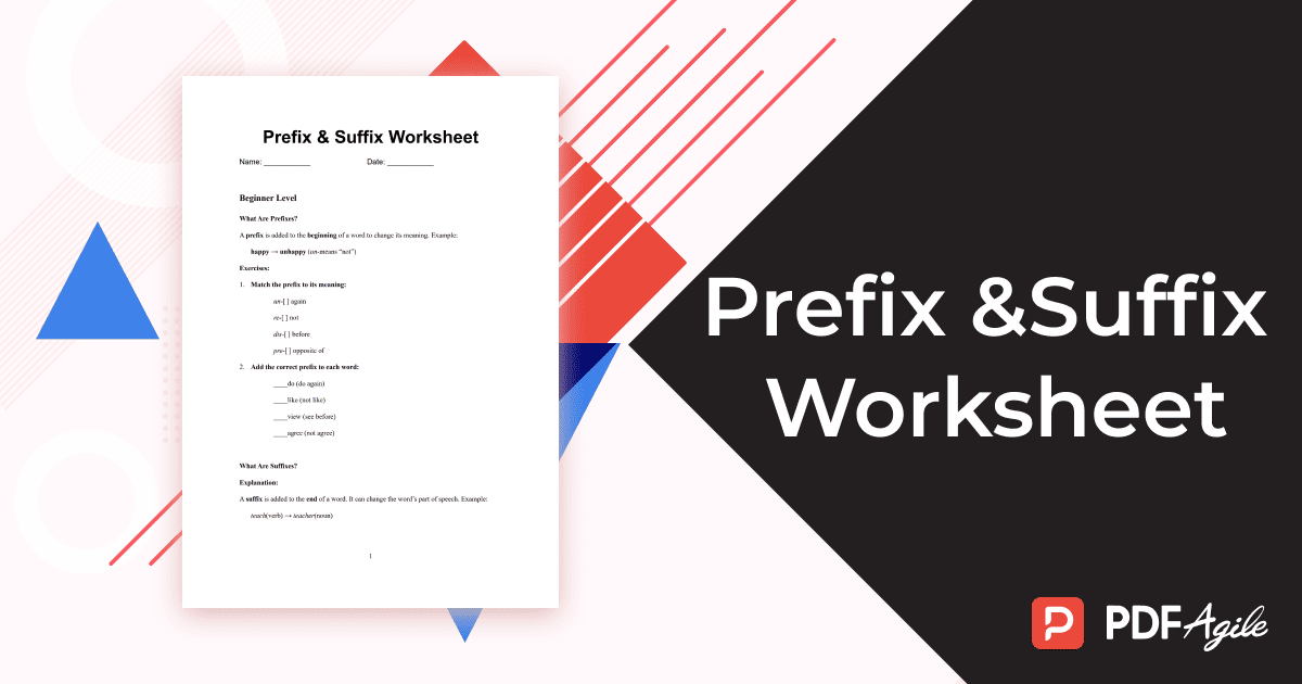 Are you looking to strengthen your understanding of English word formation in a structured, engaging way? PDF Agile’s ready-to-use Prefix and Suffix Worksheet template is designed to guide learners at every level—from beginner to advanced—through the fascinating mechanics of prefixes and suffixes. This template, which you can instantly customize and use within the PDF Agile app, offers a complete learning journey with clear explanations, practical exercises, and real-time application.