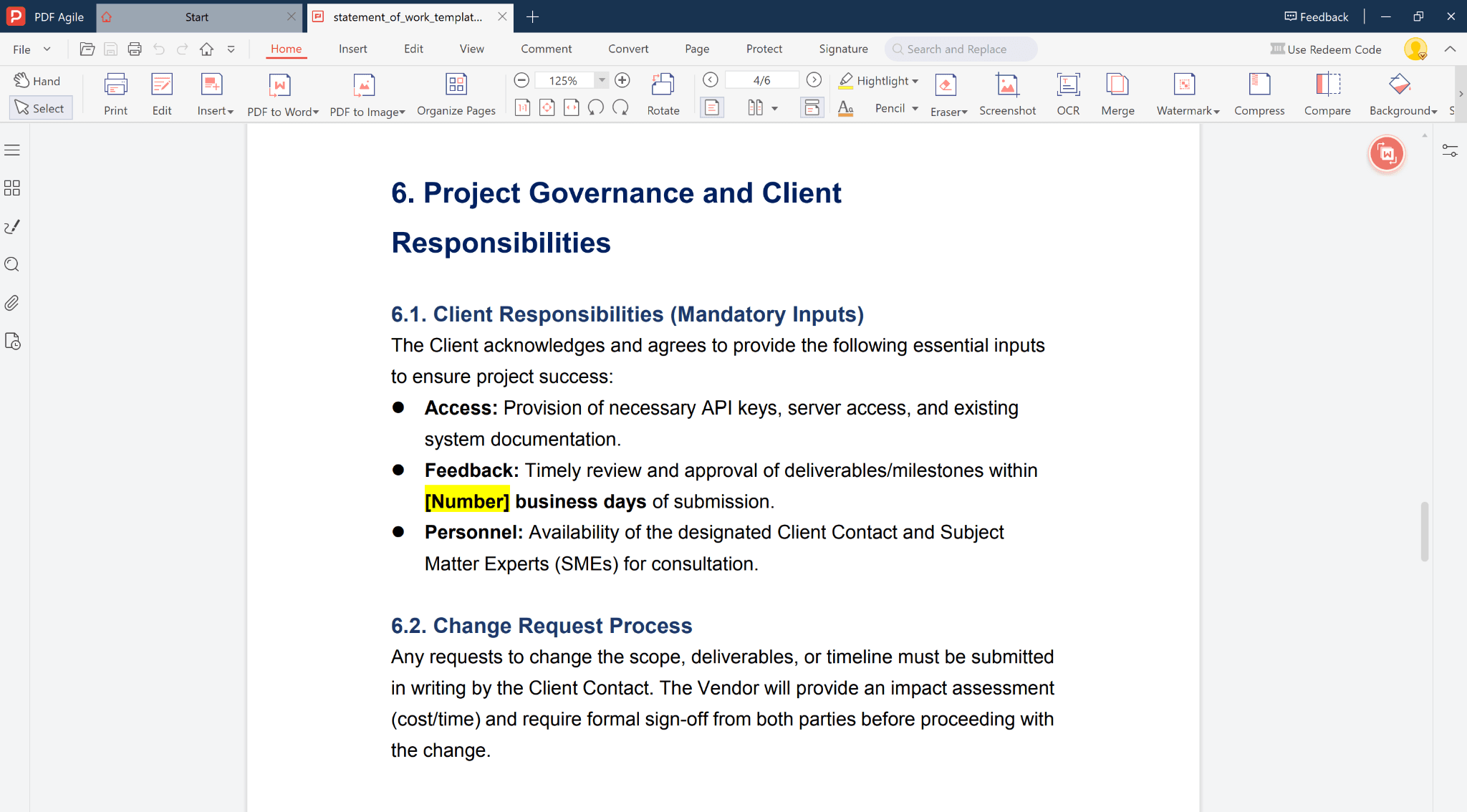 - After completing the document, review it carefully for consistency and accuracy. Make sure both sides understand every section. Once approved, sign the file electronically (via DocuSign or Adobe Sign) and save it with a clear name such as ClientName_SOW_ProjectName_v1.0.pdf