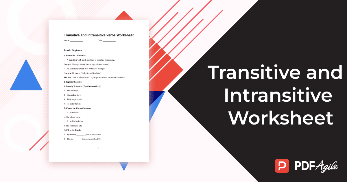 Are you struggling to distinguish between transitive and intransitive verbs? Do you find grammar exercises tedious or confusing? PDF Agile brings you a professionally designed Transitive and Intransitive Verbs Worksheet—a dynamic, ready-to-use template that transforms learning into an engaging experience. This template, structured across beginner, intermediate, and advanced levels, offers clear explanations, practical exercises, and instant feedback via an included answer key. Let’s dive into the world of verb worksheets!